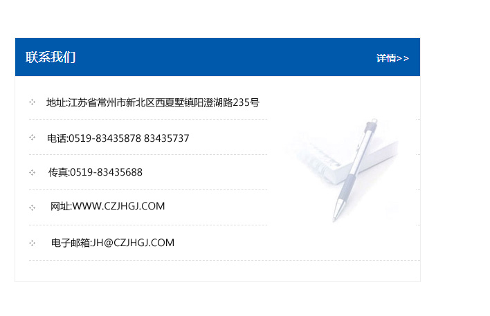 傳真:0519-83435688    郵編:213135    網址:WWW.czjhgj_com.hbbingsheng.com    電子郵箱:JH@czjhgj_com.hbbingsheng.com
